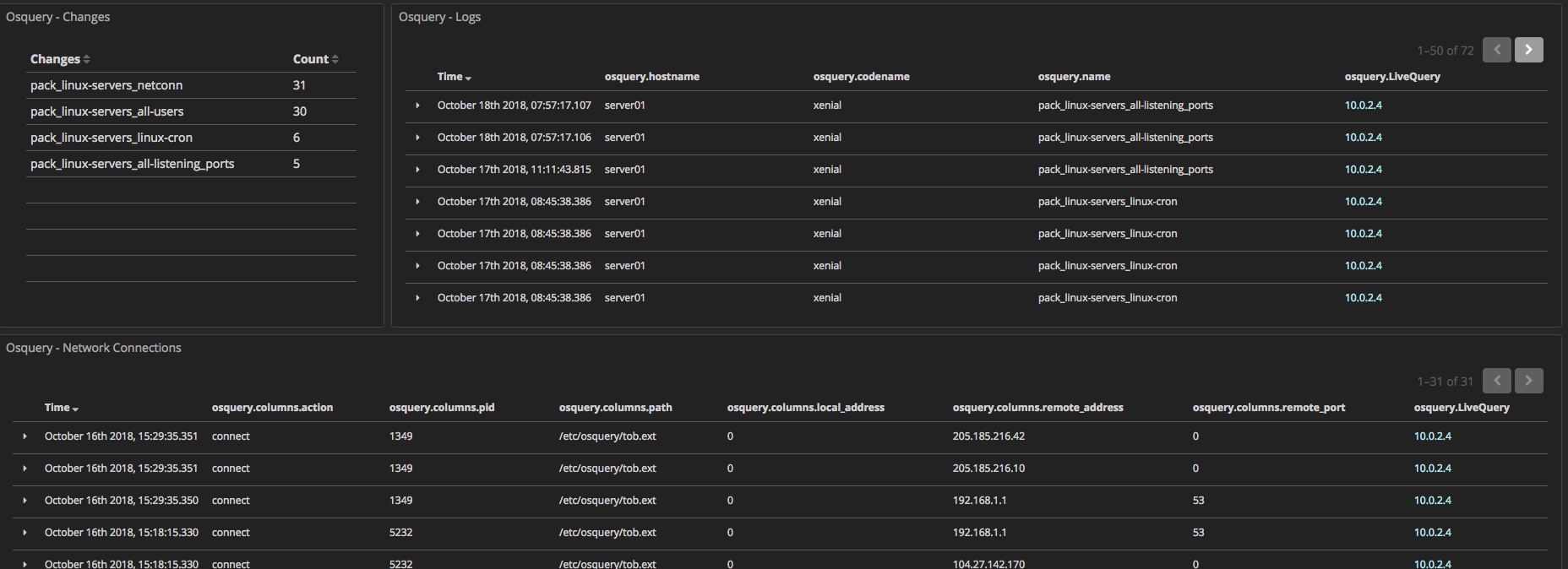 Osquery dashboard & other osquery visualizations on the Indicators page. The visualizations are tied to saved searches that use the following field: event_type: osquery